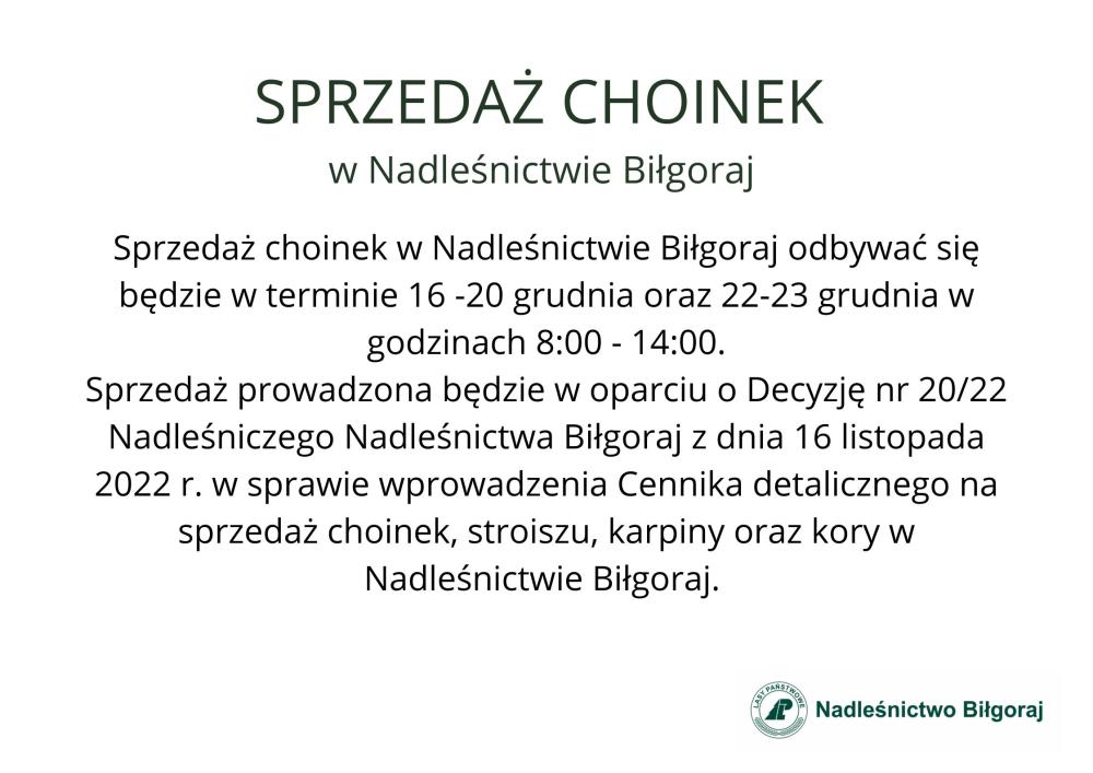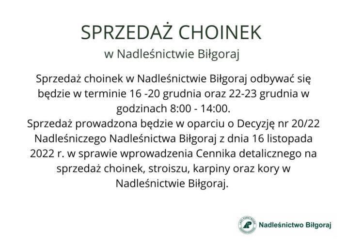 Nadleśnictwo Biłgoraj rozpoczyna sprzedaż choinek świerkowych, która będzie prowadzona w dniach 16-20 grudnia oraz 22-23 grudnia 2025r. Choinki bedzie można nabyć w godzinach od 8:00 do 14:00 na placu siedziby Nadleśnictwa Biłgoraj przy ul. Zamojskiej 96 w Biłgoraju.